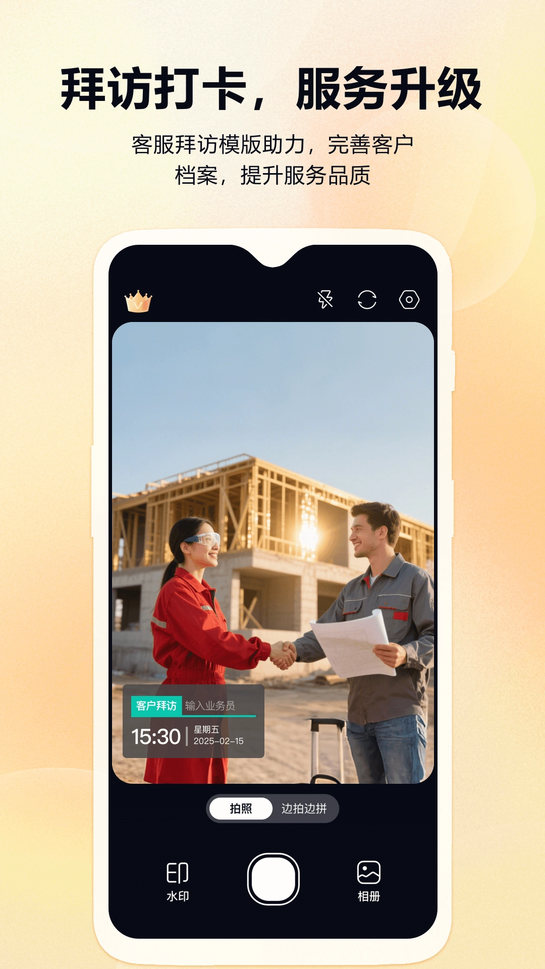 支持照片与视频两种打卡模式,用户可依据实际需求灵活切换拍摄形式,系统实时添加定制化水印。