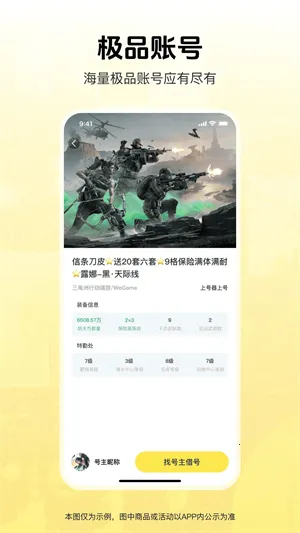 4、支持多款热门手游账号随心体验,无论是高段位账号的竞技快感,还是稀有皮肤的收藏乐趣,都能轻松实现。