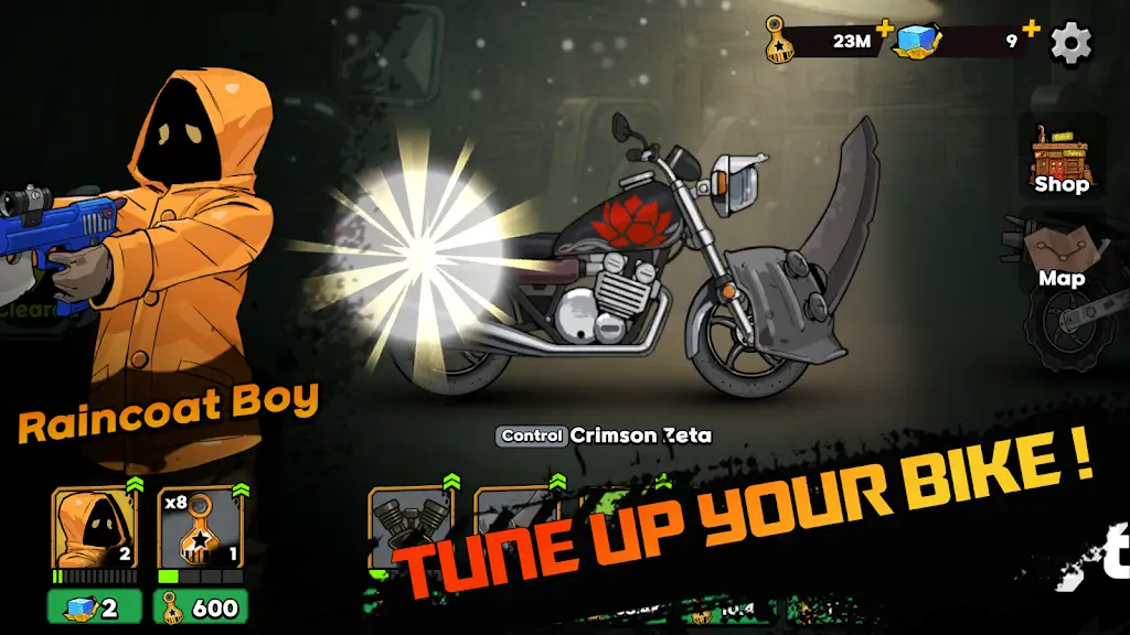 多样化角色与独特装备,猎人各具特色,有专属速度属性、武器和个性,摩托车支持全面升级与个性化定制。