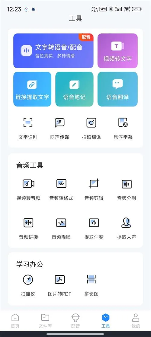 功能全面,整合多种音频操作,如学习办公、文字转语音、视频转文字、链接提取文字等,满足多样需求。