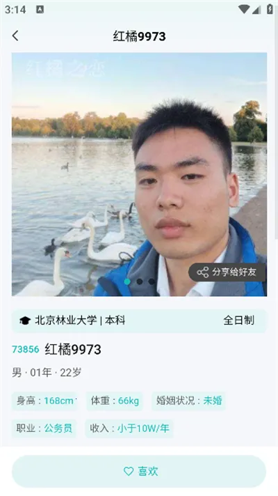 红橘之恋给单身人士提供了一个不错的相亲平台。这里的用户都经过实名认证,信息真实可靠,让人放心。其相亲模式独特,源于传统相亲角又结合现代便利,全程自主相亲,能直接和对方交流要电话,没有中介干扰,非常纯粹。能按多种条件筛选感兴趣的人,精准度高。而且发布征婚信息方便快捷,能增加脱单机会。在这个平台上,大家可以更真实地展现自己,去寻找属于自己的缘分,享受自主相亲带来的乐趣,确实是个值得尝试的相亲好去处。