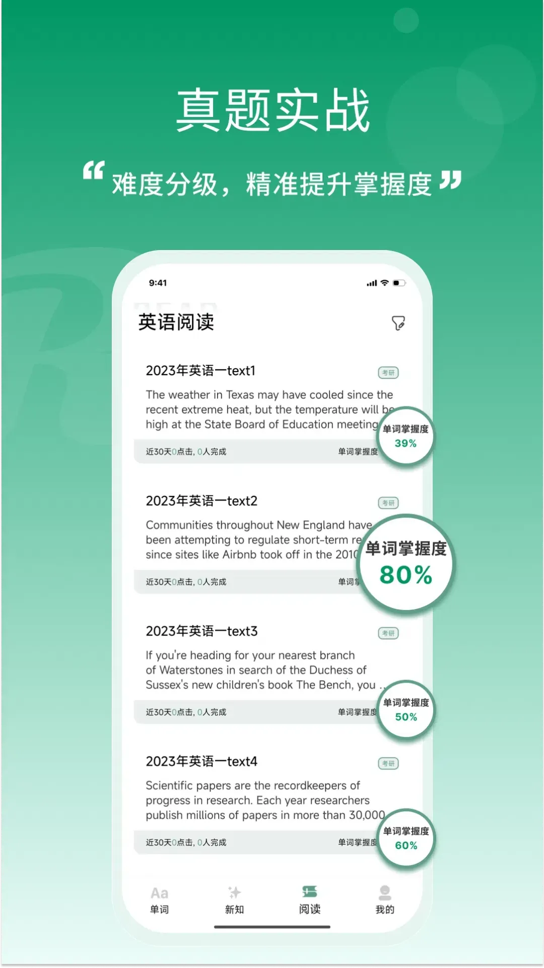 2、丰富学习场景:涵盖咖啡厅、酒店、职场等真实生活场景对话,精听跟读双模式,在实际场景中提升听力。还有外刊文章、英文原著、历年真题,支持导入本地电子书,于真实语境中记单词。