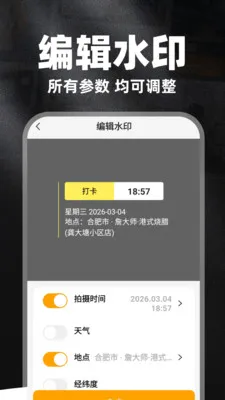 这款相机真的超棒!操作简单易上手,免费就能拥有如此丰富的功能。它能满足各种场景需求,工作中的外勤打卡、工程记录,生活里的旅行打卡、探店分享等都不在话下。水印类型多样,百余款全覆盖,无论是时间、地点还是天气等关键信息,都能轻松添加到照片中。自定义地点水印很实用,精准定位让专属角落也能成为照片亮点。而且拍照修图一步到位,既能实时加精美水印,也能给相册图片一键添水印,让每张照片都有清晰专属标识,记录生活更安心,强烈推荐!