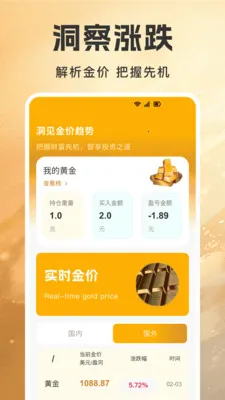 黄金账本管理,一键记录买入克数、类型、总价和日期,自动计算持仓盈亏,清晰规划黄金资产。