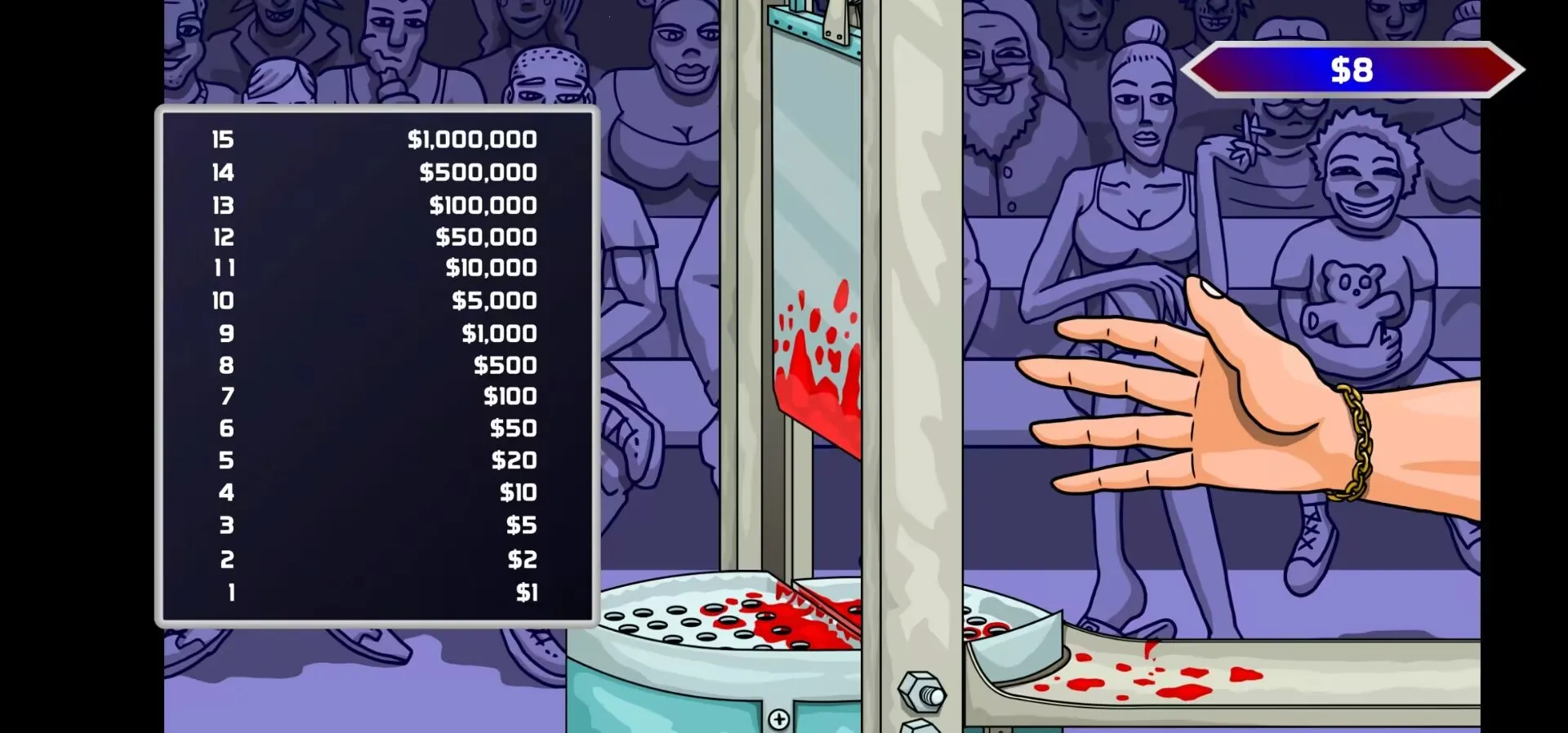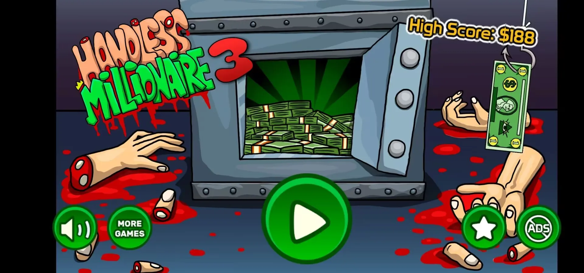 嘿,朋友们!“断手百万富翁三”这款游戏可是超刺激的!在游戏里,你就像参加一场紧张的游戏节目,有机会成为千万富翁哦!玩法很简单,把双手放在锋利断头台之间,快速拿取现金,在钱掉下来前把手收回就行。这可不是个轻松活儿,得眼疾手快,不然就可能成为手无寸铁的百万富翁啦!