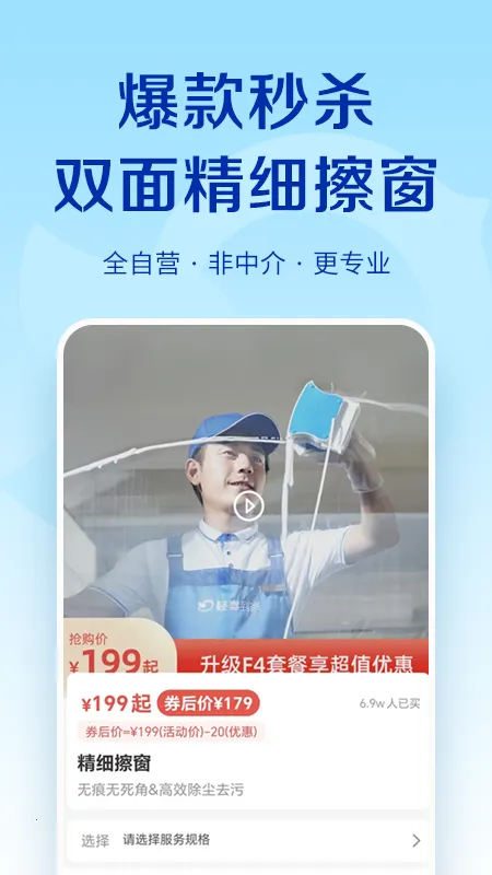 3、丰富服务种类:涵盖日常保洁、收纳整理、擦玻璃、洗窗帘、深度保洁、开荒保洁、全屋大扫除等保洁清洗;做饭保姆、月嫂、育婴师、育儿嫂等保姆育儿服务;空调、油烟机、洗衣机、冰箱清洗及窗帘挂洗等家电清洗;家具清洗消毒杀菌、居室除螨、沙发除螨、地毯清洗、全床除螨等家居养护,满足您多样的家政需求。