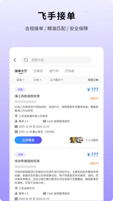 2、丰富接单机会:任务大厅持续发布航拍、测绘、巡检、植保等各类任务,能按距离、价格、需求快速筛选订单,在线报名对接,有效减少沟通成本,轻松将飞行技能转化为实际收入。