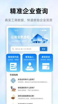 1、多维度信息查询:可查工商信息、法人股东、经营状态、司法风险、行政处罚等,全面呈现企业状况。