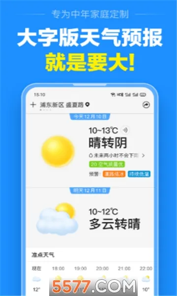 准点天气这款APP超棒的!它能提供15日天气预报,让你提前知晓未来一段时间的天气情况。不管是出门旅行、上班上学,还是日常活动,都能根据天气提前做好准备。它专门为中年家庭定制,字大图大,查看轻松。结合全球20多个数据源,精准预报40天天气,超厉害!能实时分析当前云图,实现分钟级降雨预报,下雨何时雨停一目了然。覆盖全国4万多个乡镇,全球20多万城市,精准预报身边天气。还有万余个空气质量监测站,实时检测空气质量。遇到异常天气会提前预警,还能设置桌面天气预报,方便随时查看。另外,它还有穿衣、钓鱼、紫外线、感冒、运动、洗车等生活指数,为生活出行保驾护航。有了准点天气,再也不用担心天气变化啦!