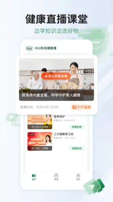 HUJ禾优健是一款提供专业直播课堂传授健康知识,同时严选好物助力健康饮食选购的应用。它实现一站式学习与选购,能让用户轻松吃出好体质,全方位守护全家人健康。