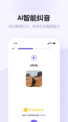 2、AI智能纠音,借助先进技术实时精准纠正发音并打分,支持句子高亮显示,提升发音准确度。