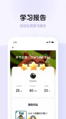 3、学习报告自动生成,涵盖自动打分、实时统计学习数据及生成作品小视频,方便了解进度成果并分享。
