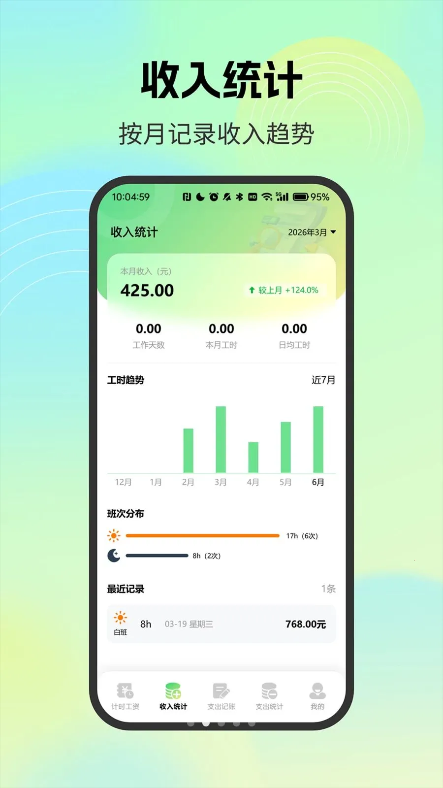 薪资记录小管家 2026 可让用户轻松管理工时收入、日常开销。具备计时工资计算、收入统计、支出记账等功能,通过多种视图和图表清晰呈现财务状况,支持工资条记录,首次发版,方便兼职与上班族记账统计。