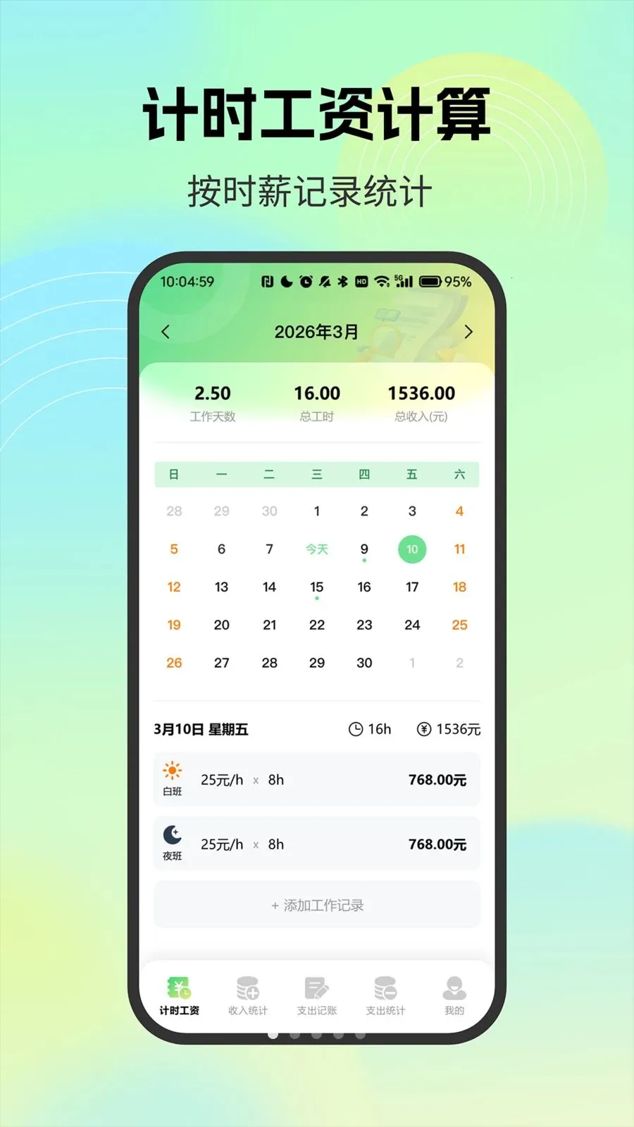 2、便捷记录工作收入:可按日历记录每日工作时间和时薪,自动计算当日收入,还支持多班次标记。