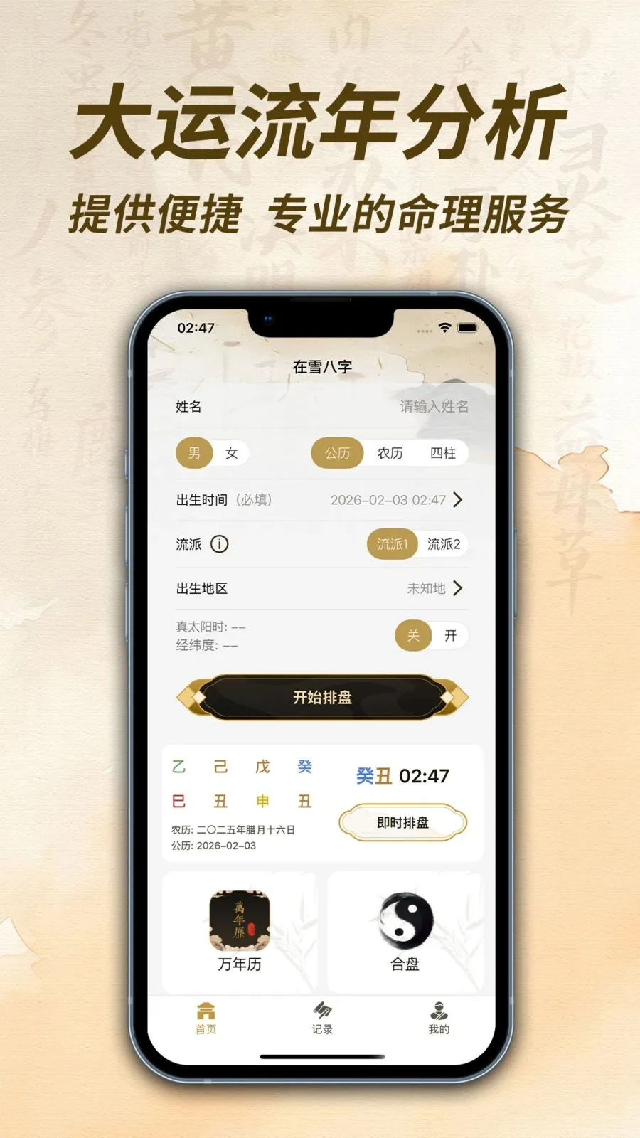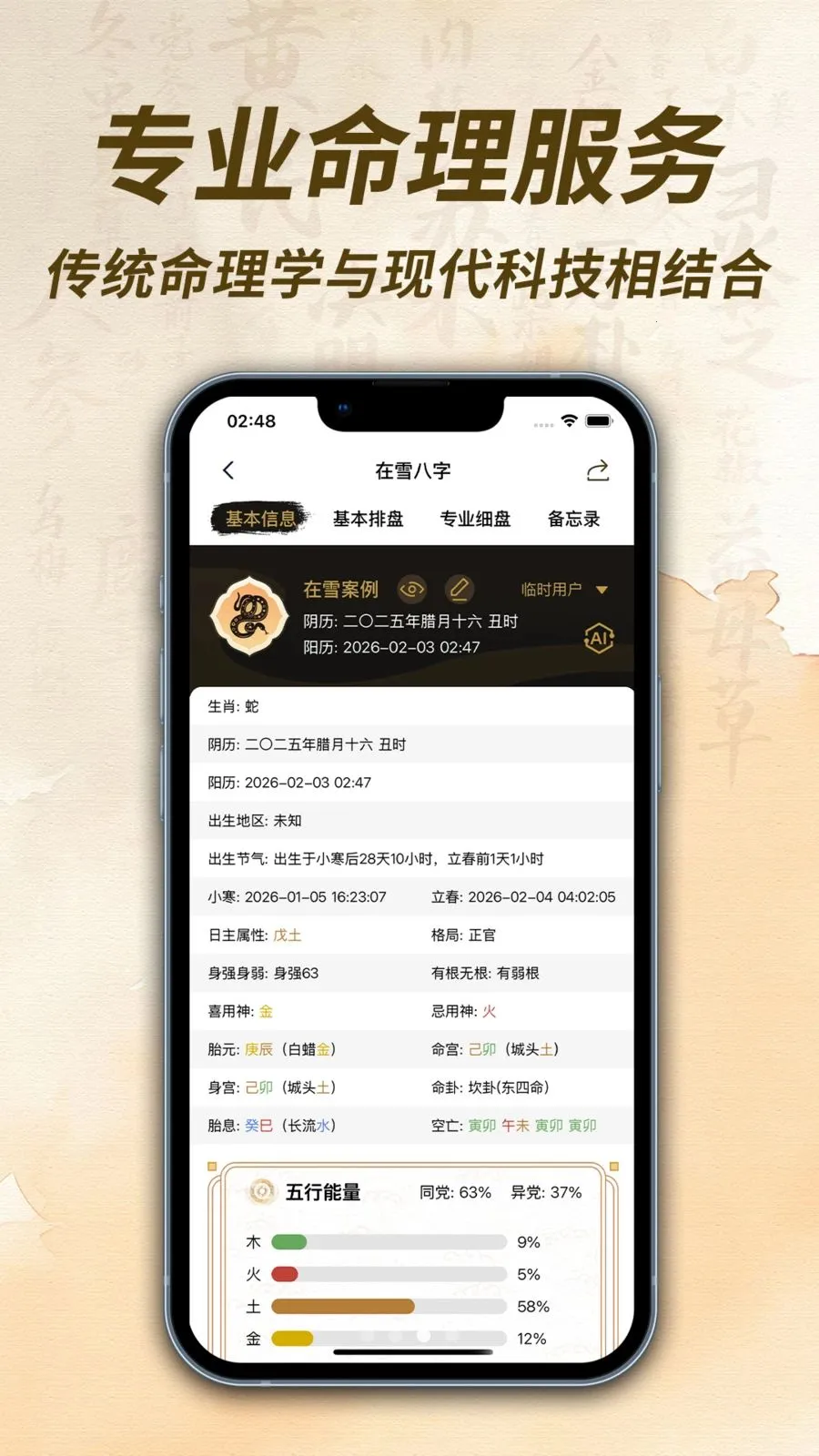 1、专业八字命理分析:能为您精准呈现八字排盘、大运流年分析以及合盘配对等内容。