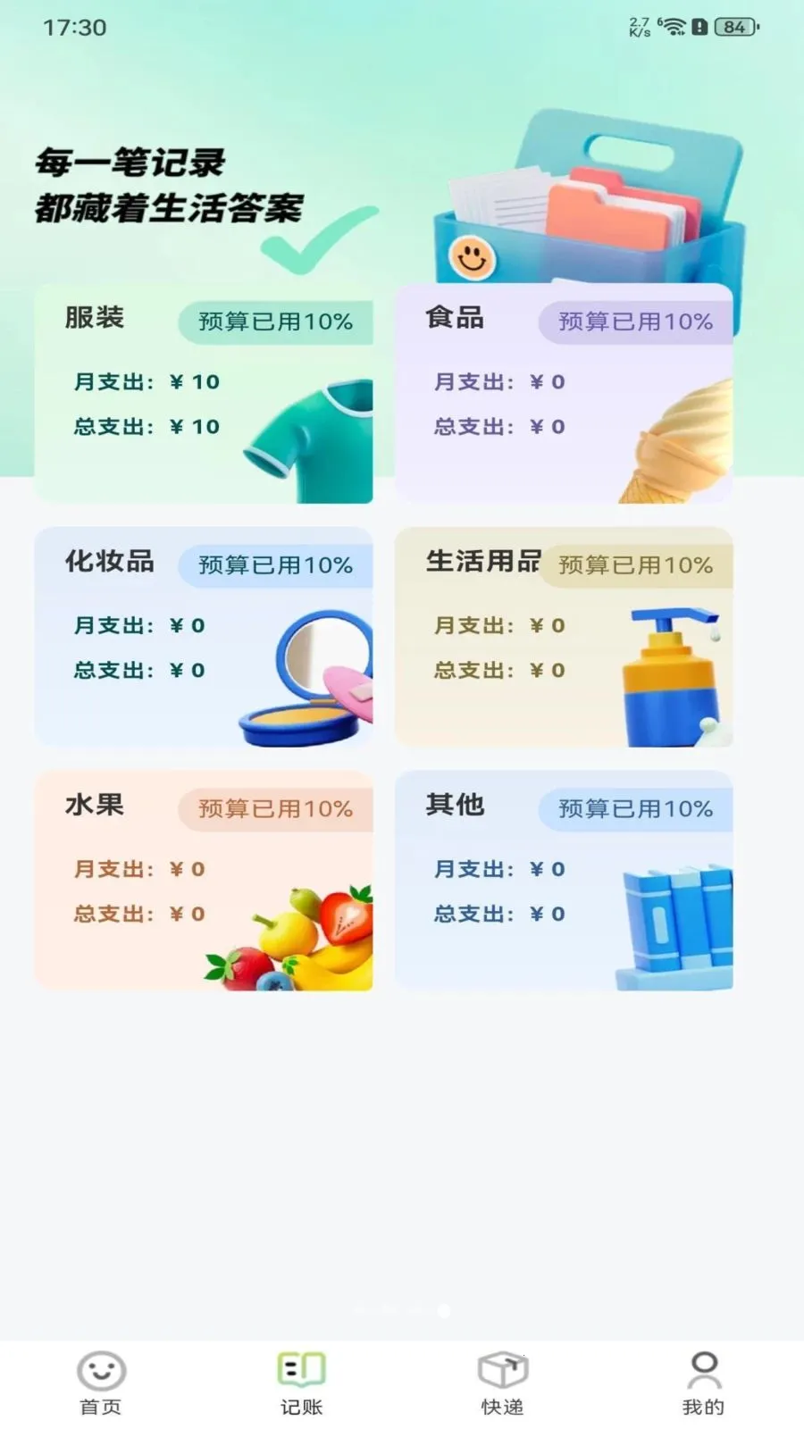 贴心记账功能,可分类记录各项支出,清晰显示月支出、总支出及预算使用情况,助您把控生活消费。