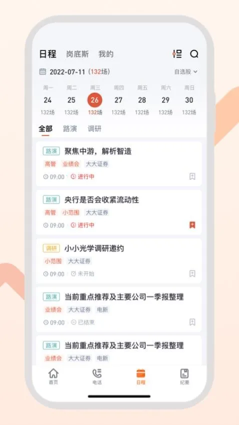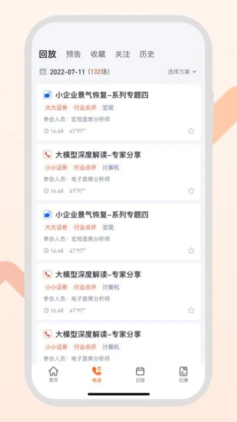 它的功能超实用。在线回放能提供完整会议内容回放,帮你回顾要点;日程查看是直观日历界面,轻松查阅每日安排;在线搜索强大,快速定位所需资讯;支持个性化订阅,第一时间获取关注领域最新纪要;还有便捷收藏功能,能构建个人知识体系;多维度筛选机制可精准匹配专业金融分析方案。