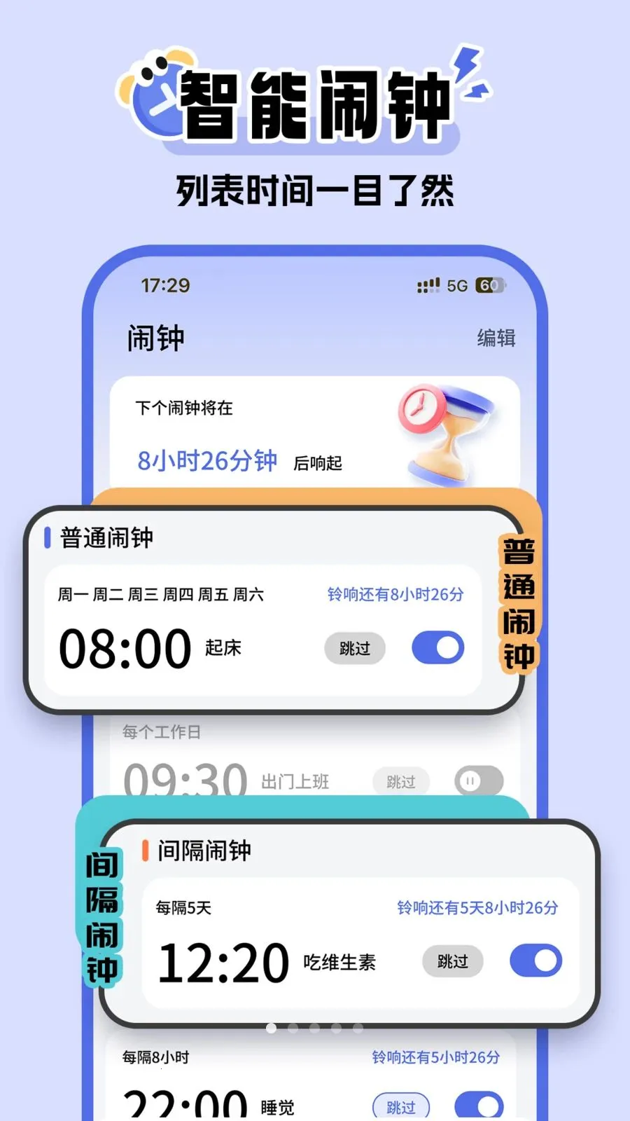 间隔闹钟可自定义时间间隔循环提醒,设置分钟、小时、天、月级重复周期,适用于学习专注、工作间歇、运动计时、喝水提醒、定时服药等多种场景。