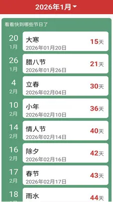 这款日历软件真是中老年人的贴心之选。它体积小安装快,运行速度也快,简单易用,不会给用户带来困扰。干净不打扰、简单不繁琐的设计,让人用起来格外舒心。它将万年历、日历、天气、节气、节假日等功能集于一体,内容全面。而且致力于做贴心的日历应用,新版还修复了bug,使用体验更佳。无论是查看日期,还是了解各种信息,都非常方便。对于中老年人来说,操作轻松,能满足日常需求,真的是一款很不错的日历软件,值得推荐。