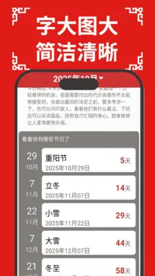 1、专为中老年设计,贴心实用,是一款集万年历、日历、天气、节气、节假日等多种功能于一体的软件,满足中老年人的各种需求。
