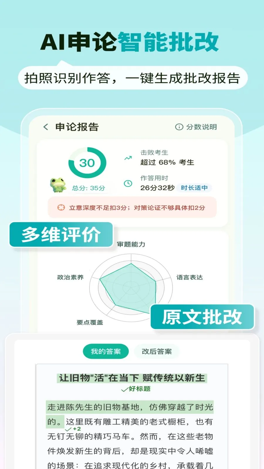 AI智能批改超强大,面试逐句听,申论拍照出报告,详细指出问题并给出得分预估,3分钟出结果,高效又准确。