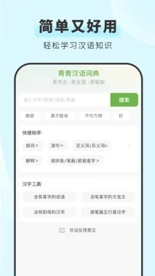 青青汉语词典是适合汉语学习及爱好者的工具。收录超7万汉字,涵盖通用、常用及生僻字。集多种查询功能于一身,有规范严谨的检索方式、语音辅助等,还含成语大全、古诗词鉴赏,免费下载可离线畅学。