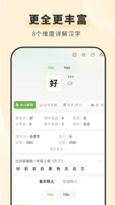 3、多维度查询:提供拼音、部首、笔画等多种查询方式,自定义搜索一键直达目标字词。