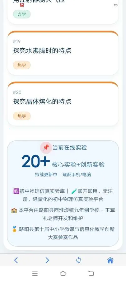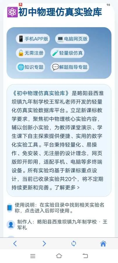 初中物理仿真实验库是王军礼老师开发的轻量化数据库。立足新课标,聚焦核心实验与创新小实验,秉持轻量化理念,网页版即开即用,适配多终端,已收录20个实验,还会持续更新完善。