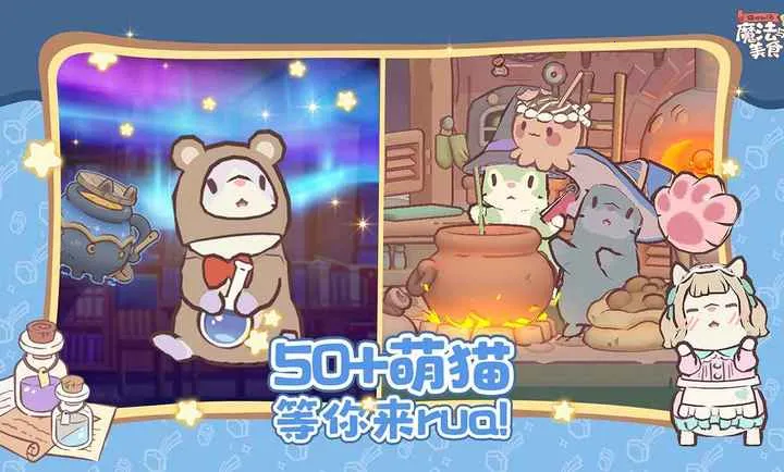 猫咪和汤:魔法与美食是一款魔法美食合成游戏。玩家可拖拽合成食材解锁300魔法食谱,赚取星星升级星空树屋。每升一级能召唤新猫咪、解锁装扮,还有50萌猫等你互动,见证木屋变梦幻星空塔。