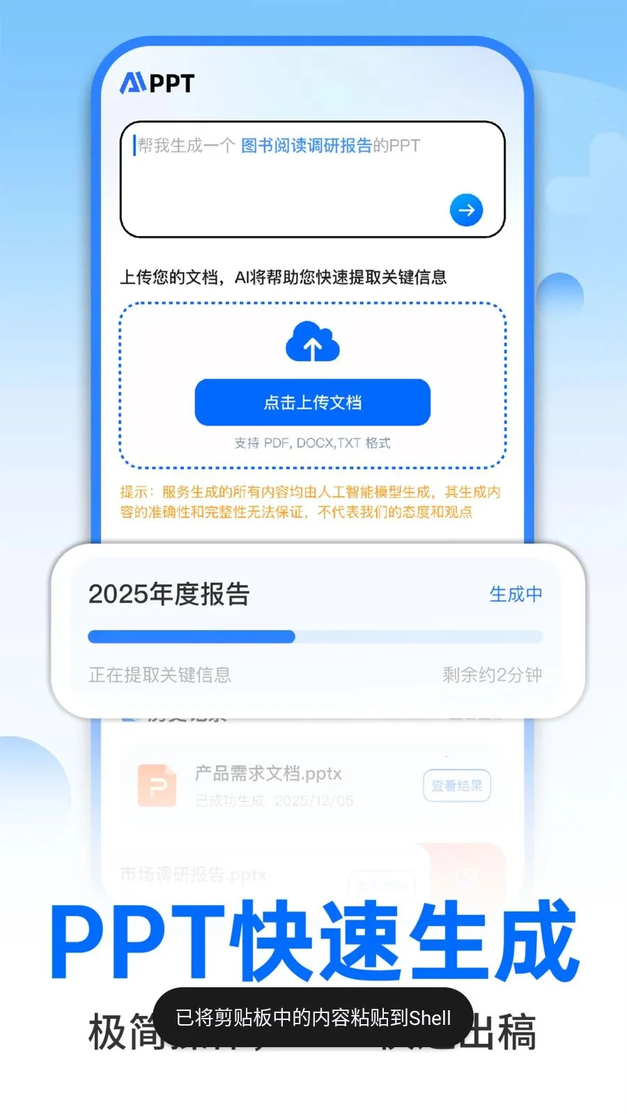 1. **高效 PPT 生成**:上传文档后,AI 自动提取关键信息,通过极简操作快速生成 PPT 初稿,大幅节省制作时间。