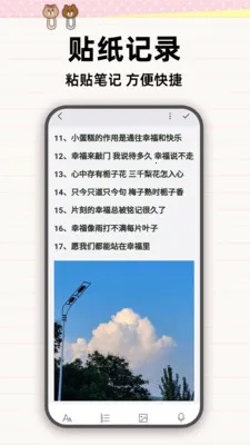 1. 多形式记事:支持文字、图片、语音、视频等多种记录方式,可完整留存灵感、心情、旅行瞬间等,让回忆清晰可寻。