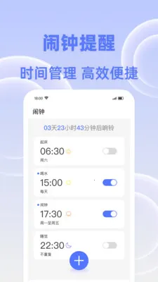 你是否在寻找一款能带来欢快叫醒体验的闹钟工具呢?这里有满足你需求的相关产品。它功能超丰富,操作还简便。基本的闹钟功能自不必说,能确保你按时起床。关键是还支持自定义铃声,你可以设置成那首欢快的《闹钟响叮当儿歌》,每天伴着愉悦旋律醒来。贪睡模式、振动提醒也都有,可根据自己需求设置单次、每日或工作日闹钟,从此不再错过重要事项。它还有悬浮时钟、秒表、计时器等实用工具,方便你随时掌握时间。甚至能通过内置日历提醒日程安排,规划好每天事务。界面简洁美观,操作流畅,不管是日常生活还是工作场景,它都是你的得力小帮手,让你的时间管理井井有条,轻松开启每一天。