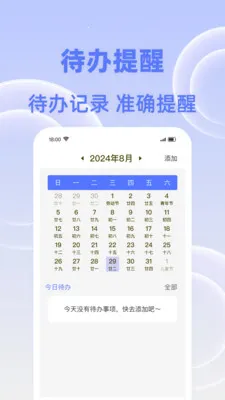 4. **待办贴心**:可高效规划日程,支持添加、删除待办,设置标题和主要内容,通过日历清晰呈现,助力用户有条不紊安排事务。