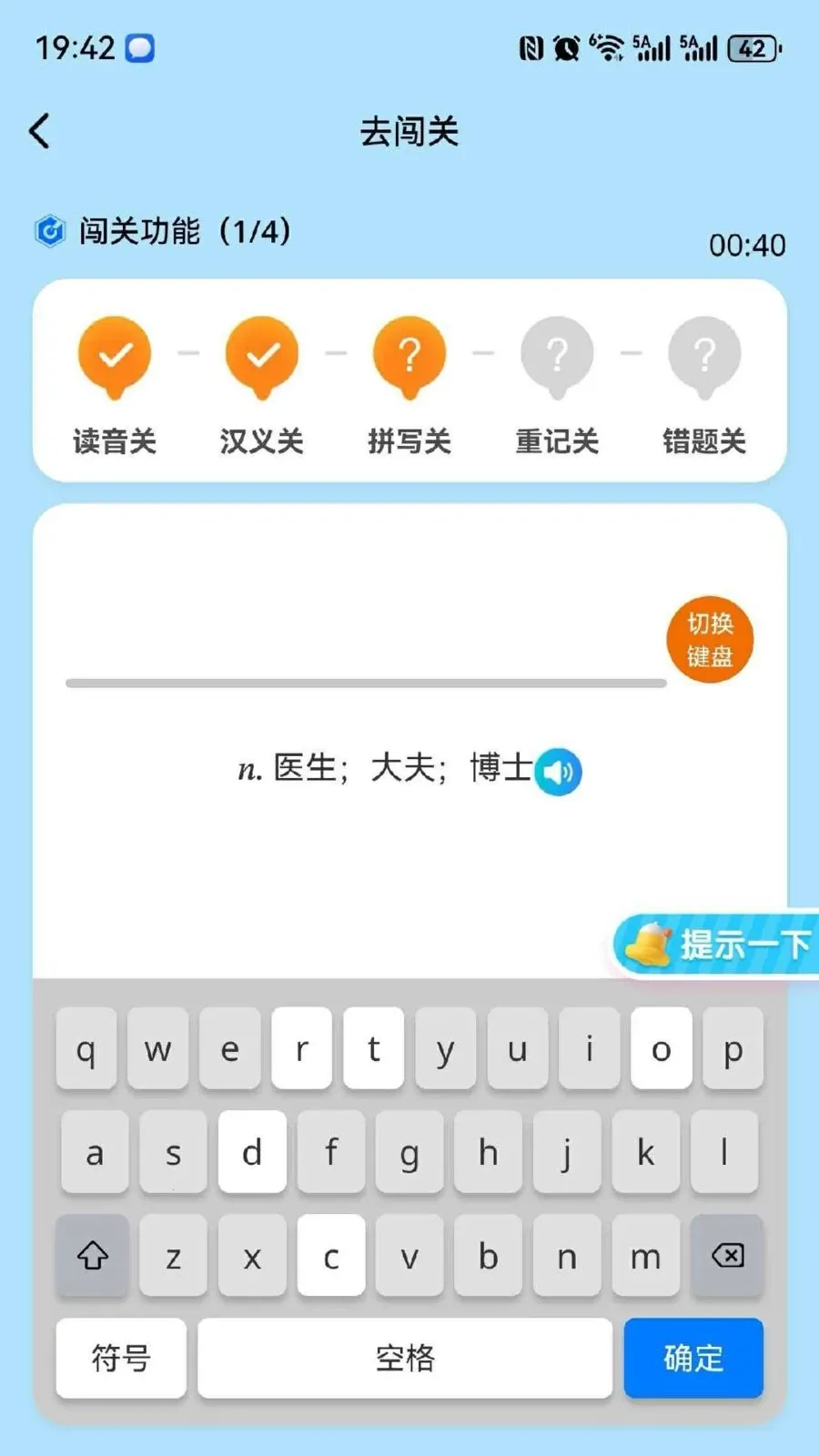 3. 软件设有闯关系统,包括读音关、汉义关、拼写关、重记关、错题关五关。