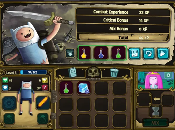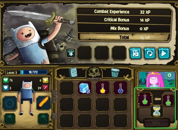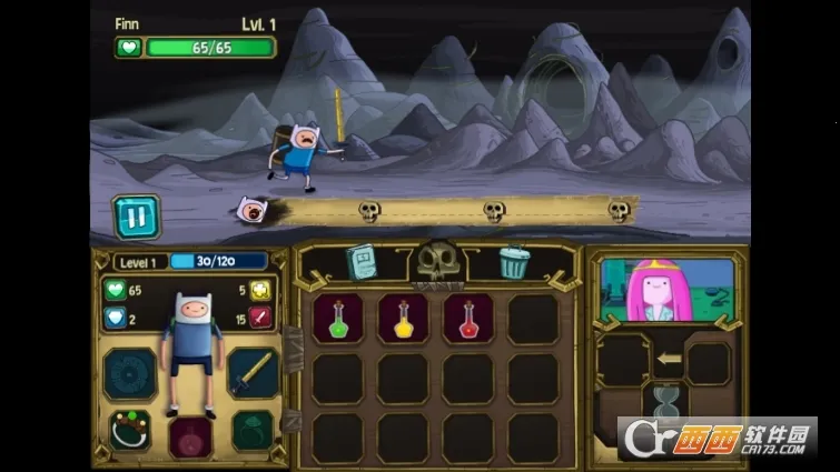 玩法很简单,点击NewGame开启新游戏,或者Continue继续之前的。战斗中,将药水拖进阿宝任务下的框框就能及时补充。战斗胜利随机得物品,混合物品创造更好的。它休闲有趣,闲暇时玩超爽,还能体验混合物体的惊喜,快来为阿宝打造金装,与骷髅兵决一死战吧!