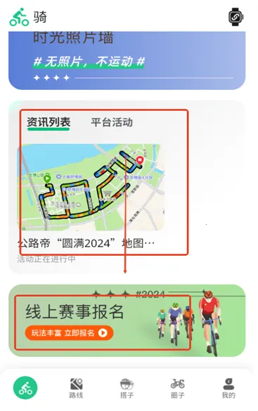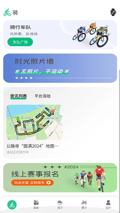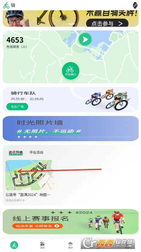 2. 登录后进入首页能看到当前在线骑友,页面往下拉可看到圈内资讯及线上赛事报名入口。