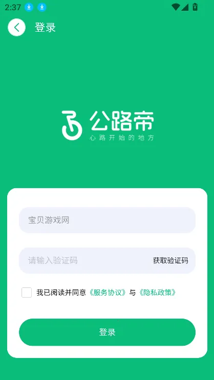 1. 在宝贝游戏网下载安装公路帝安卓版,点击同意并接受进入“我的”,会直接弹窗登录界面,直接输入手机号验证就可登录。