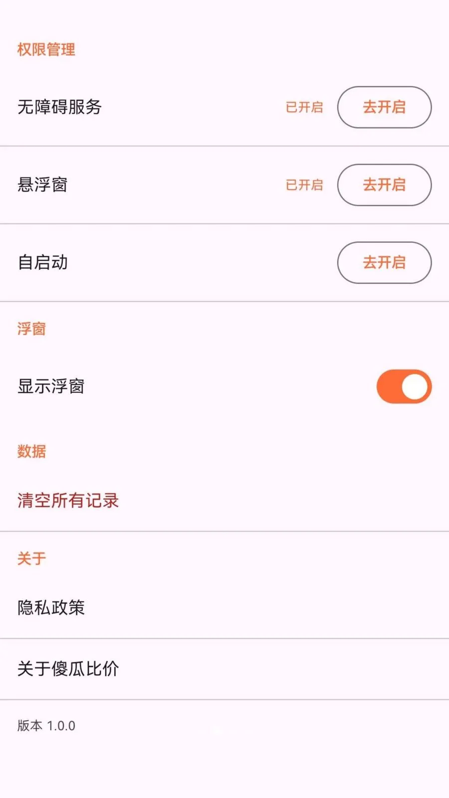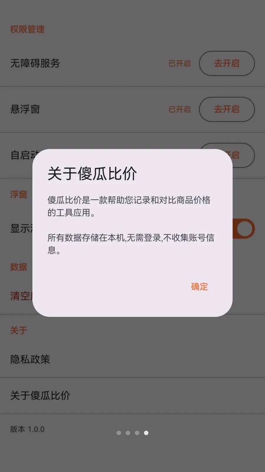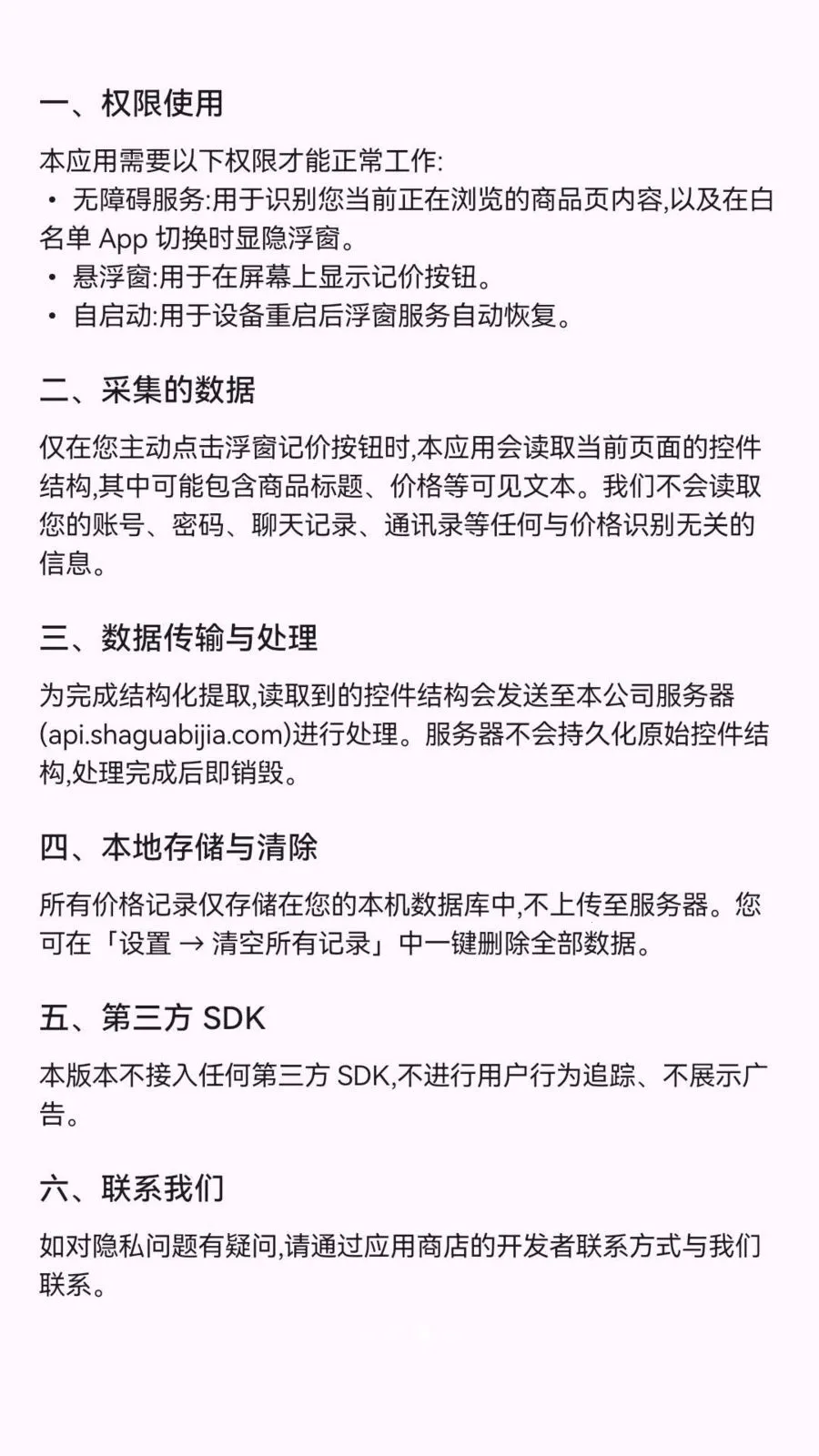 4. 所有价格记录仅存手机本地数据库,不用登录账号,不收集身份信息,不接入第三方SDK,不展示广告,不追踪用户行为,设置里可一键清空全部数据。