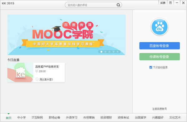 百度传课是一款即时通讯工具。网友可以直接通过KK客户端,即轻松实现购买课程、进入教室、课程评价、个人信息设置、添加好友、好友聊天、视频语音等多项操作。