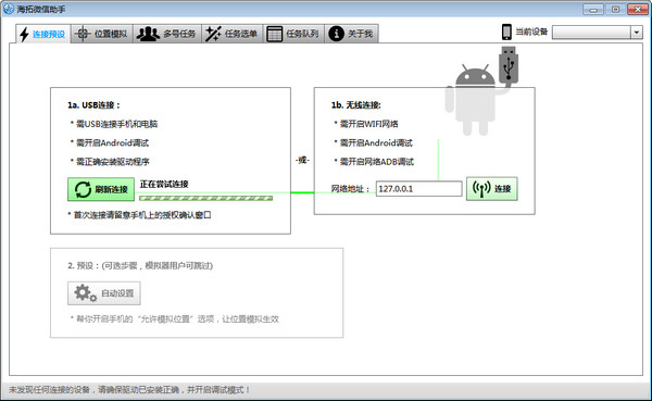 如果是使用手机,请确保打开了“允许模拟位置”的选项,可以使用软件的“连接预设”功能页面中的“自动设置”帮你打开的手机设置里面的“允许模拟位置”的选项,你也可以手动打开 “设置”-“开发者选项”-“允许模拟位置”;
