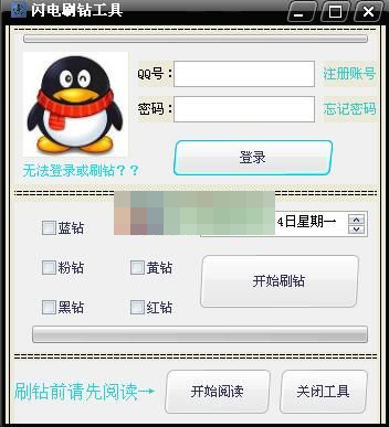 闪电刷钻工具是一款绿色小巧的QQ刷钻工具。软件功能强大,操作简单。通过该软件,你只用输入账号和密码,就能够帮助你在一分钟之内迅速刷钻。要注意的是,刷钻的时候千万别登录QQ!