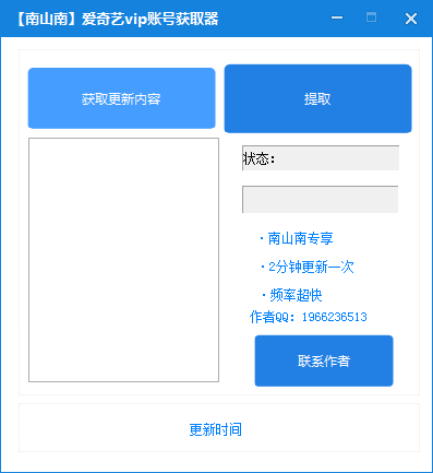 南山南爱奇艺VIP账号获取器(爱奇艺VIP账号采集器)是一款绿色免费的由网友南山南制作的最新免费的爱奇艺会员账号获取软件,此款软件可以帮助用户一键轻松获得爱奇艺会员账号密码,软件账号2分钟更新一次,保证使用质量。