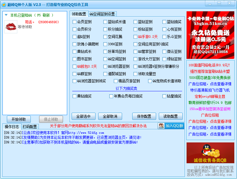 本版本主要面向对象为号少的,个人本地用户,操作简单,打开Q神后。直取本地已登陆QQ,选择要领取的项,点开始领取即可