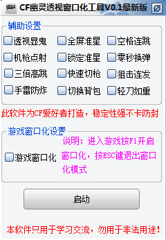 这是一款支持游戏窗口化、透视显鬼、全屏准星、手雷防炸等实用功能的穿越火线游戏辅助。欢迎来此下载使用!