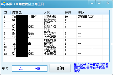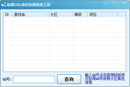 这是一款能够帮助用户查询任意QQ号在LOL所有区的游戏ID以及段位的LOL查询工具。有需求的可以来此下载。