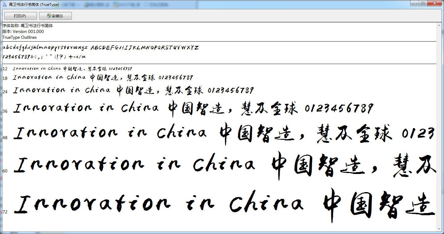 禹卫书法行书简体是一款以毛笔行书书为主的GB_2312字库,这里包含了常用字和生僻字共6763个,可广泛适用于微软OFFICE的各种软件、QQ、MSN等常用聊天工具、PHOTOSHOP等主流绘图软件。