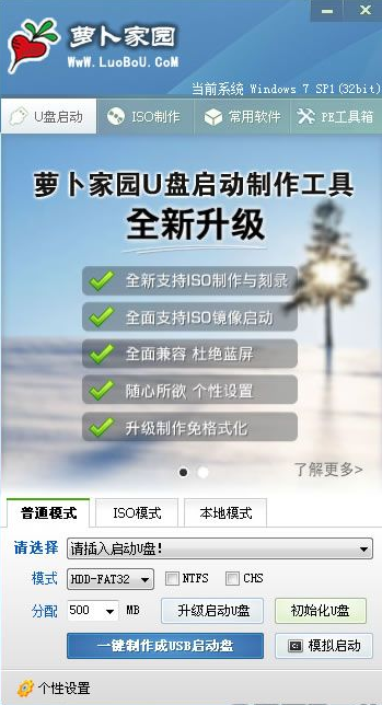 第二步:用萝卜家园U盘装系统软件制作启动U盘