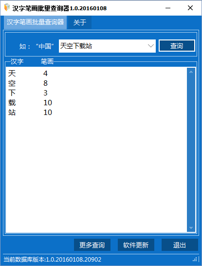 汉字笔画批量查询器是一款绿色小巧的由三生有幸网推出的汉字笔画批量查询工具,采用文本检索技术,内置20000多条信息,支持快速批量查询汉字笔画。