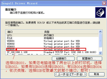 端口选择USB001,如果您电脑连接了两台以上的打印机,选择USB002,如果有USB003选择USB003,有USB004选择USB004,依次类推,选择USB后数字最大的那个USB端口,即可。