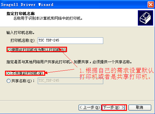 根据自己的需求设置默认打印机或者是共享打印机,然后点击下一步。